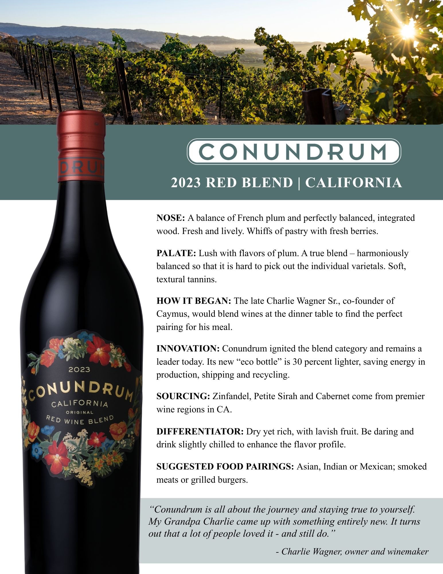 Fresh fajitas. Relaxing before dinner. A night out for Thai or Vietnamese. Conundrum White goes with them all. Sourced from California’s premier winegrowing regions, this wine is both exotic and bright, a blend of Chardonnay, Sauvignon Blanc, Semillon and Viognier. It lures you in with scents of apricot, pear and honeysuckle, and if you’re paying attention, orange and lemon meringue pie. Initial sweetness is balanced by natural acidity, and we love the hint of oak that plays with flavors of peach, apple and citrus. The long finish will leave you longing for another glass.